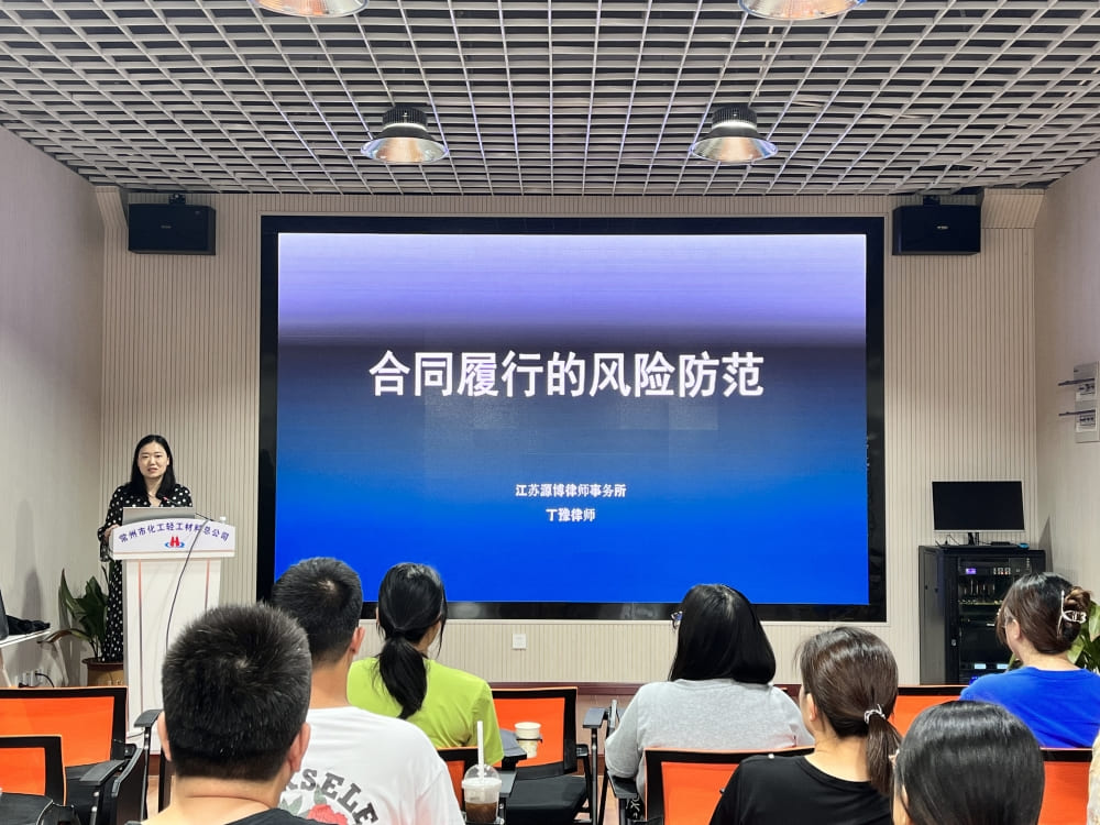 第二天下午,江蘇源博律師事務(wù)所丁律師向大家講解了合同履行的風(fēng)險防范,公司法務(wù)王雨甸就風(fēng)險管控相關(guān)注意事項與大家分享交流。